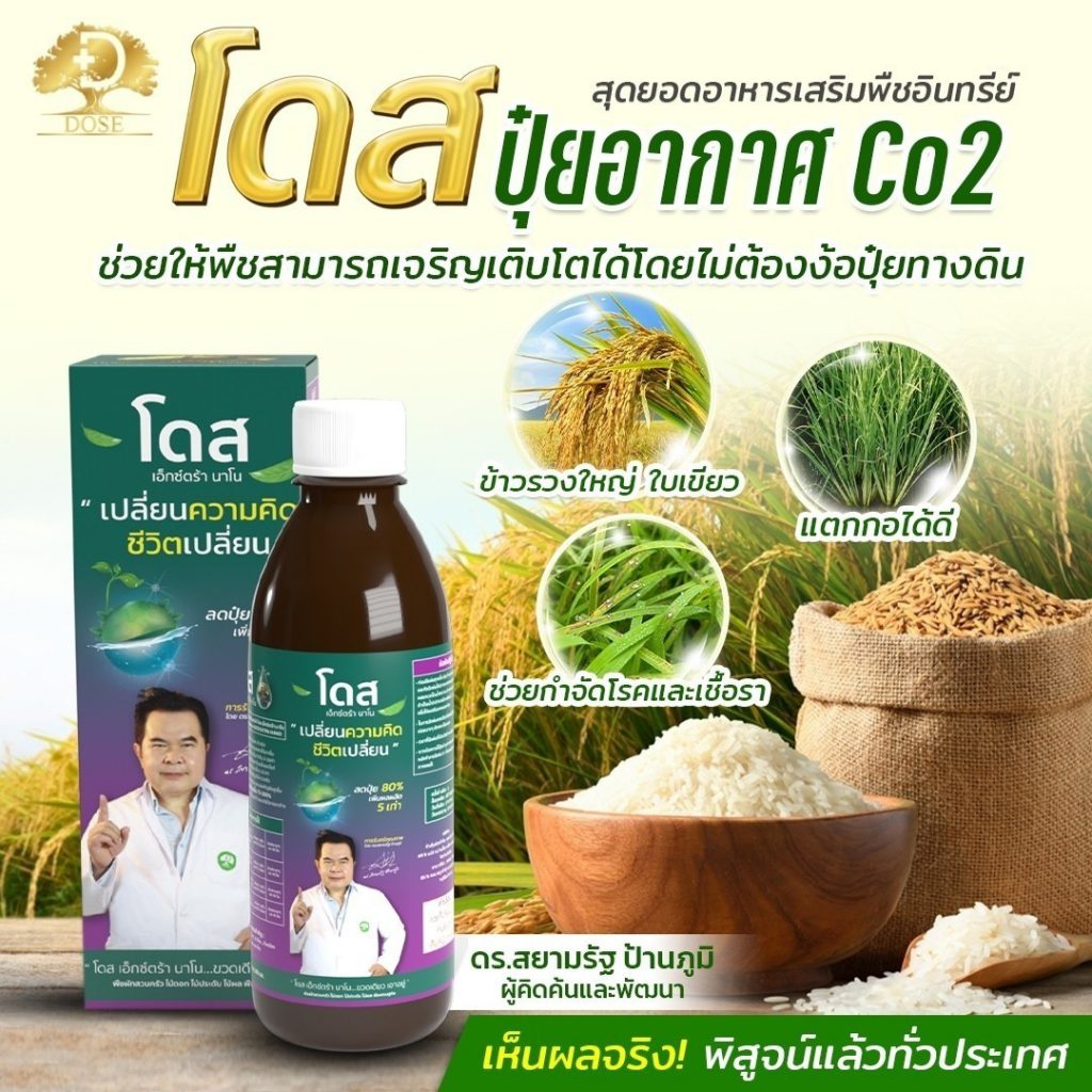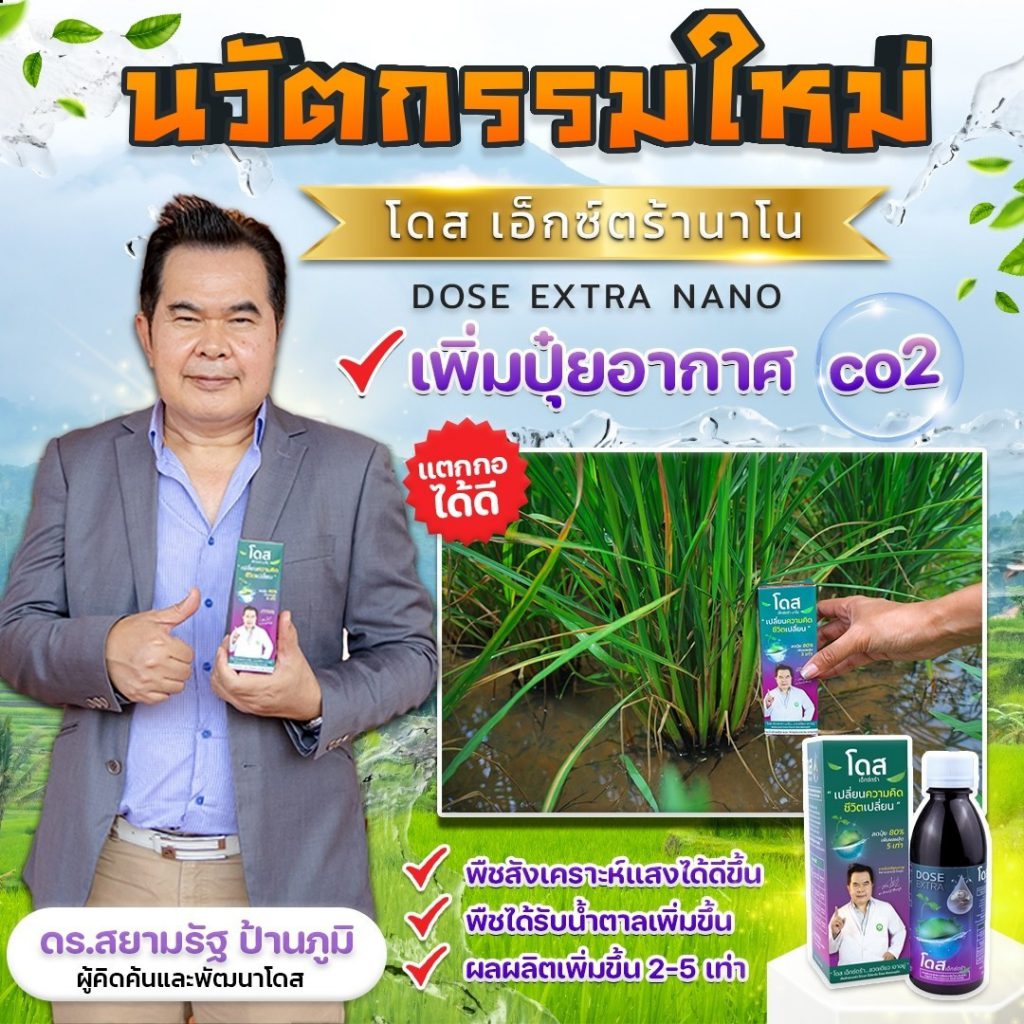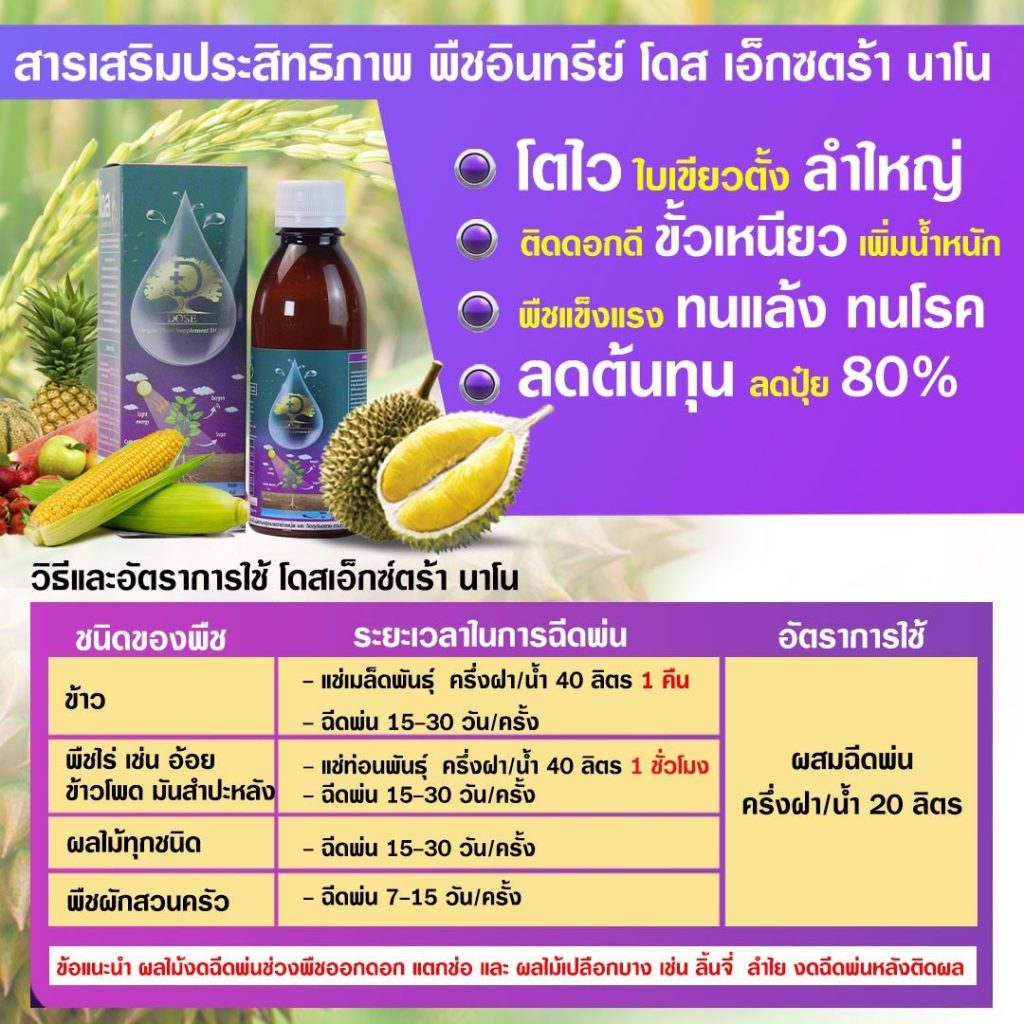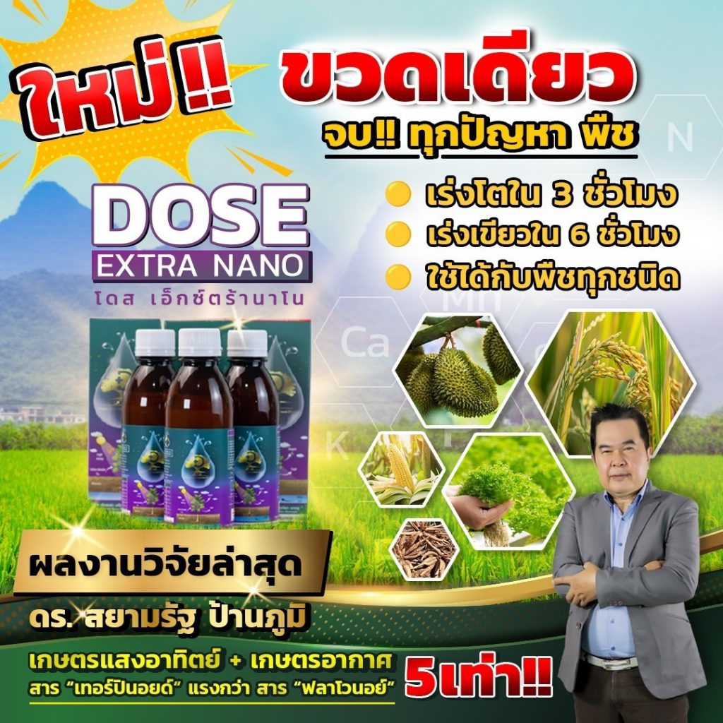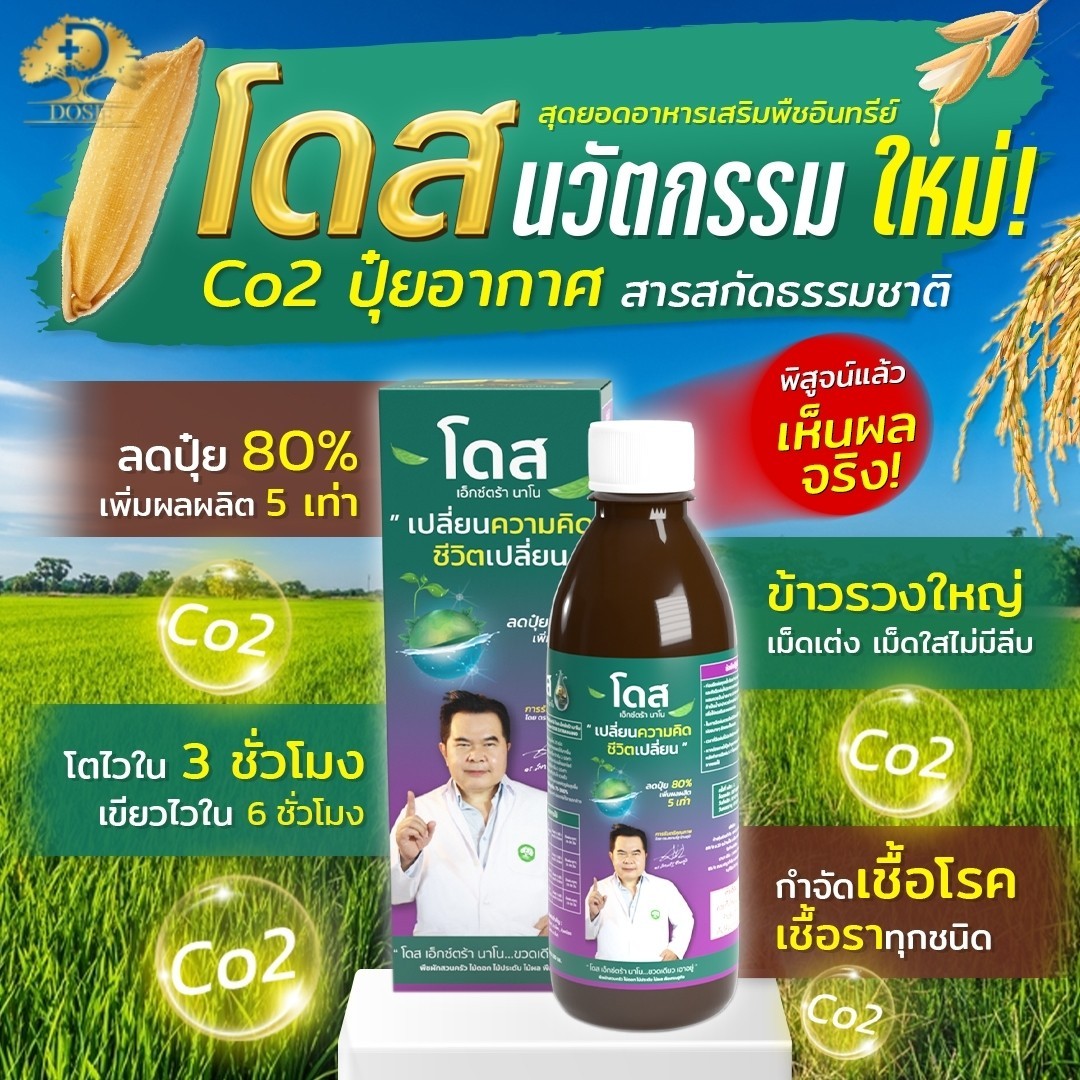 โดส เอ็กซ์ตร้า นาโน สารสกัดจากพืซสมุนไพรธรรมชาติ 25 ชนิด รวมทั้ง เทอพีนอยด์ (Terpenoids) สารเสริมประสิทธิภาพ ช่วยให้พืชสังเคราะห์แสง ดูดซับ ก๊าซคาร์บอนไดออกไซด์ (ปุ๋ยอากาศ) ได้สูงถึง 10 เท่า ช่วยบำรุงพืช ทั้งโครงสร้าง แต่ตั้งระดับเซลล์ ส่งผ่านไปยังทุกระบบ ราก ลำต้น ใบ ผล ช่วยให้พืช โตไว ต้นสมบูรณ์ แข็งแรง ทนทานต่อสภาวะอากาศ ต่อโรคและแมลง ลด การใช้ปุ๋ย และยา พ่นได้กับพืชผัก ไม้ผลทุกชนิด ข้าว มันสำปะหลัง ปาล์ม อ้อย ทุเรียน ลำไย พริก และอื่นๆ