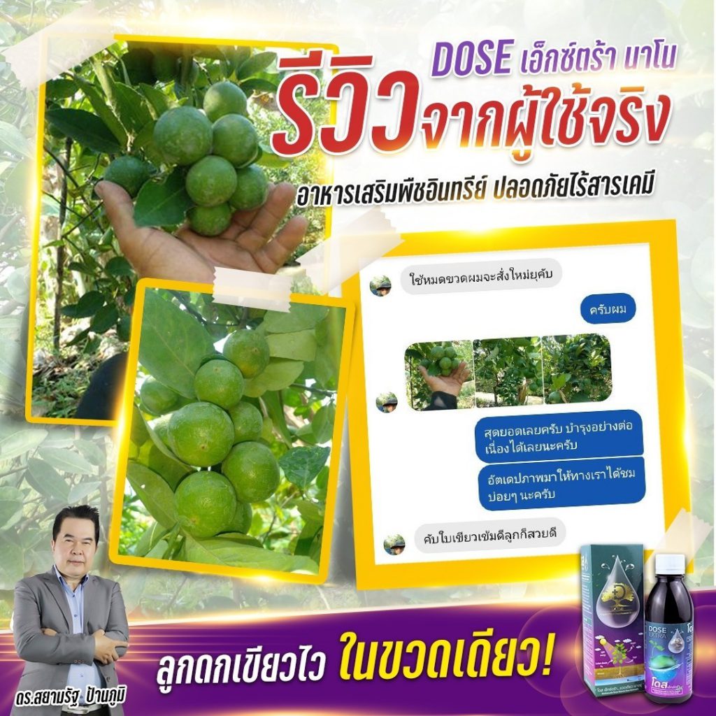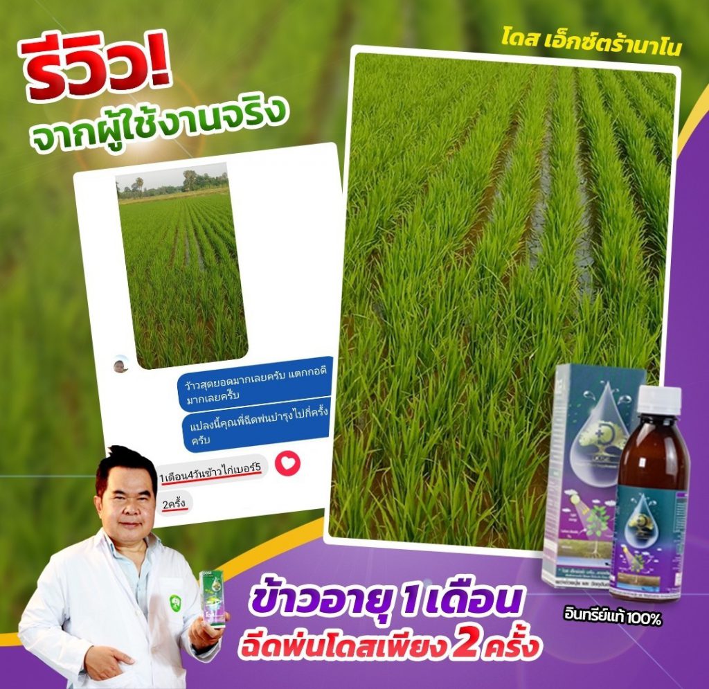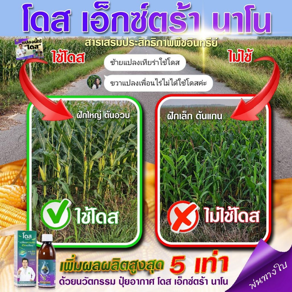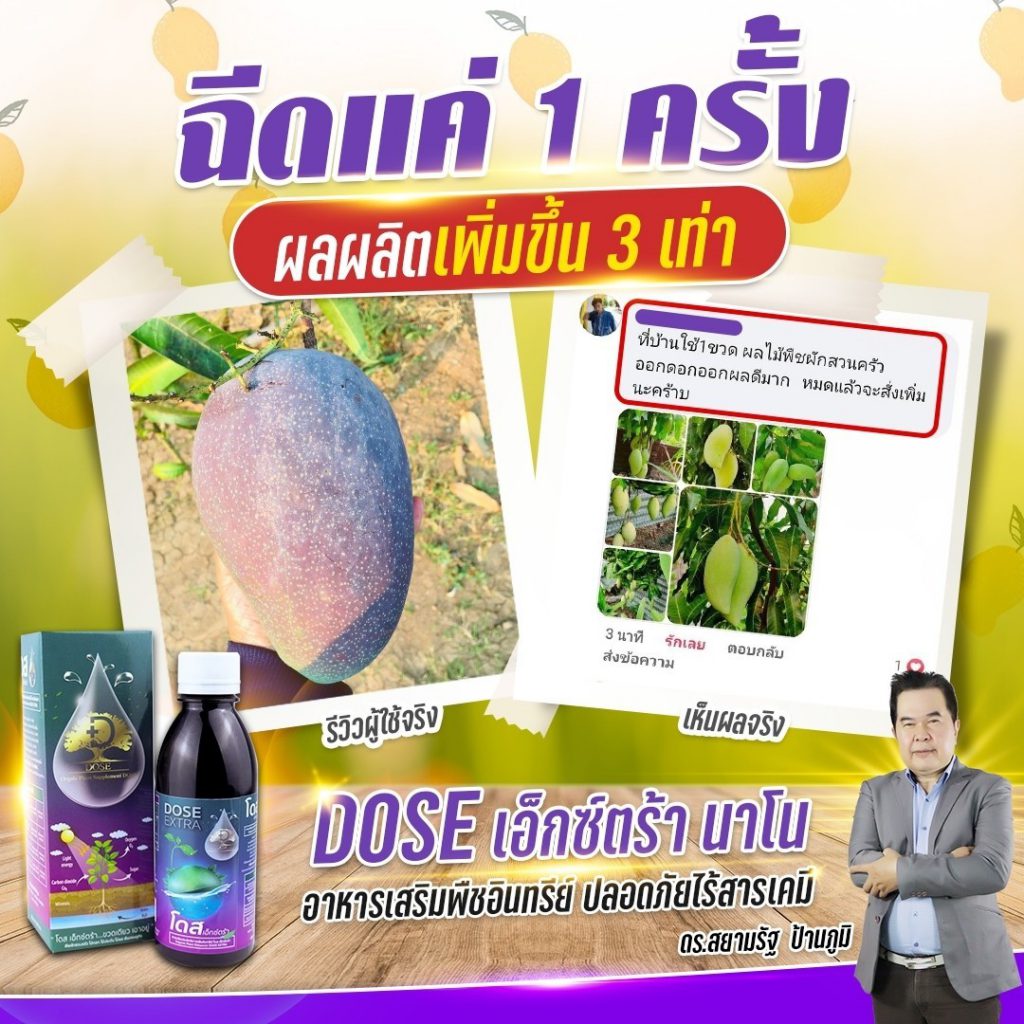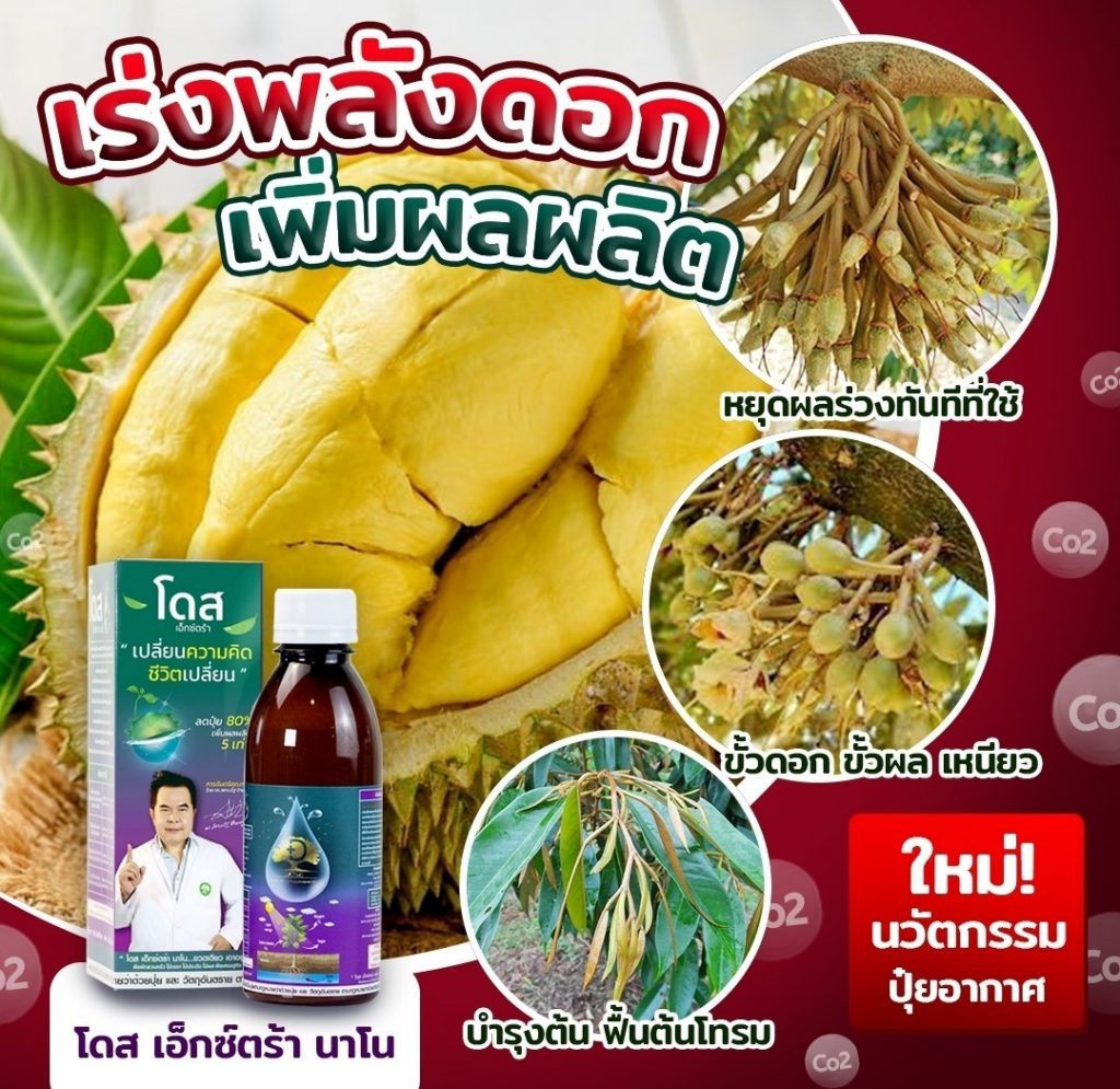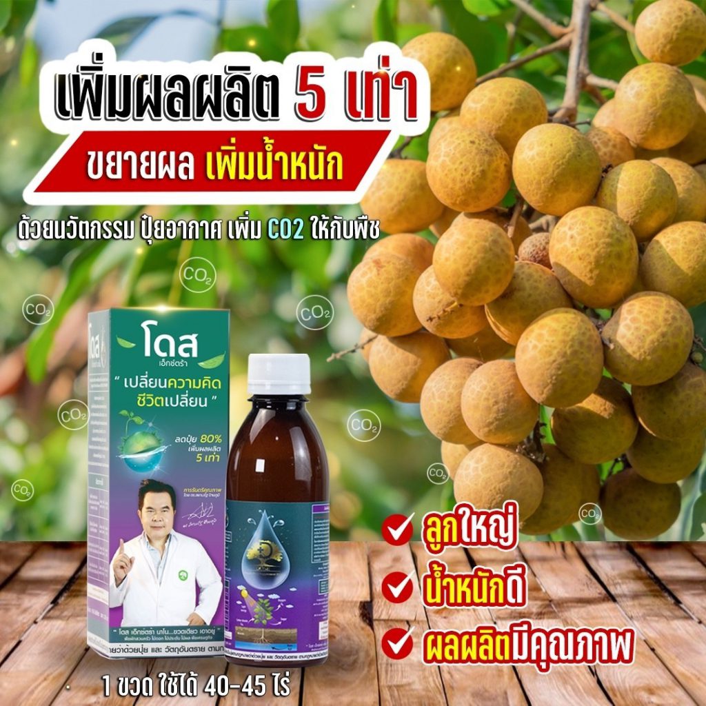 โดส เอ็กซ์ตร้า นาโน สารสกัดจากพืซสมุนไพรธรรมชาติ 25 ชนิด รวมทั้ง เทอพีนอยด์ (Terpenoids) สารเสริมประสิทธิภาพ ช่วยให้พืชสังเคราะห์แสง ดูดซับ ก๊าซคาร์บอนไดออกไซด์ (ปุ๋ยอากาศ) ได้สูงถึง 10 เท่า ช่วยบำรุงพืช ทั้งโครงสร้าง แต่ตั้งระดับเซลล์ ส่งผ่านไปยังทุกระบบ ราก ลำต้น ใบ ผล ช่วยให้พืช โตไว ต้นสมบูรณ์ แข็งแรง ทนทานต่อสภาวะอากาศ ต่อโรคและแมลง ลด การใช้ปุ๋ย และยา พ่นได้กับพืชผัก ไม้ผลทุกชนิด ข้าว มันสำปะหลัง ปาล์ม อ้อย ทุเรียน ลำไย พริก และอื่นๆ